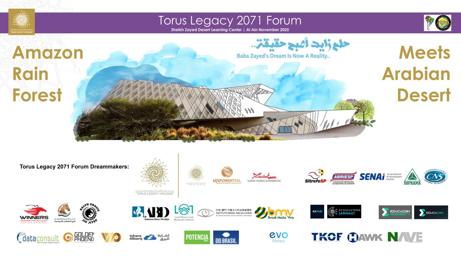 We will explore and brainstorm and discuss the future at the Torus Legacy 2071 Forum agenda, happening at the stunning Sheikh Zayed Desert Learning Centre in Al Ain!